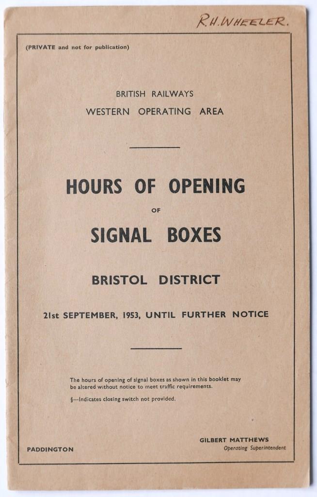 | 56 | BR(W) booklet ‘Hours of Opening of Signal Boxes – Bristol District’. 16pp dated September 1953. | £42 |  |