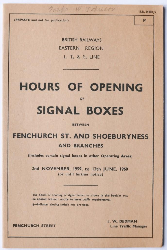 | 58 | BR(E) LT&S Line booklet ‘Hours of Opening of Signal Boxes between Fenchurch St and Shoeburyness and branches’. 11pp dated November 1959. | £32 |  |