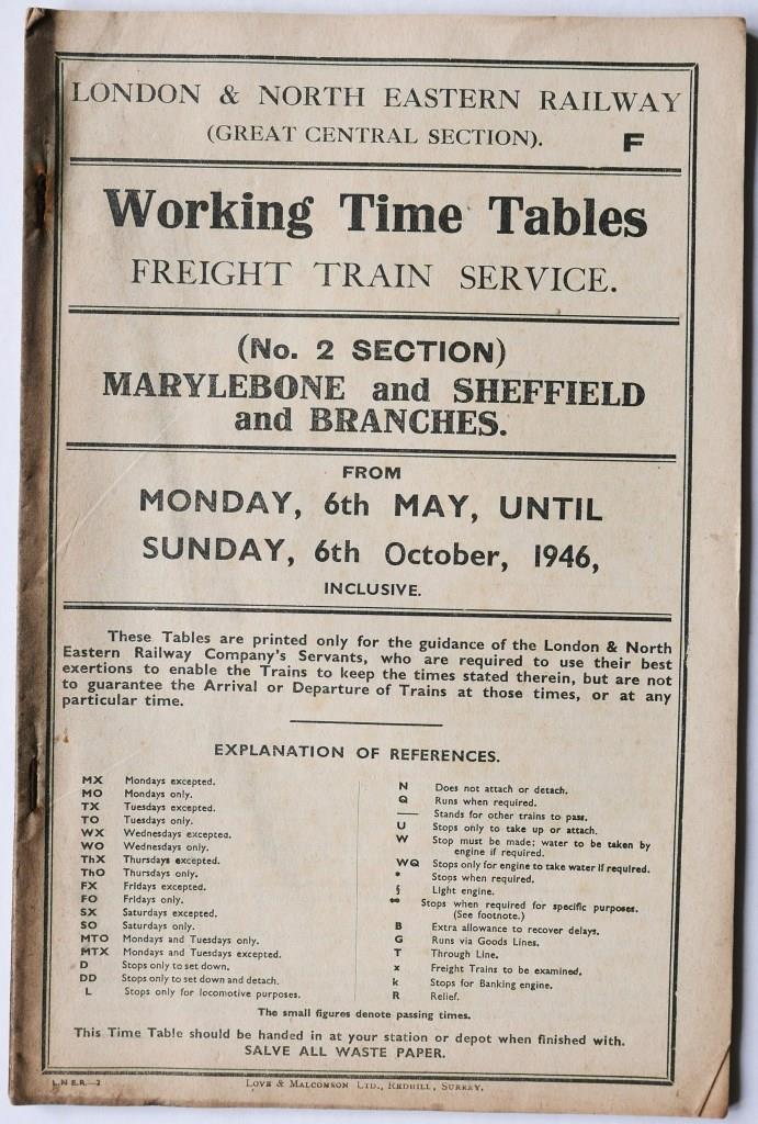 77BR(M) Midland Division section 12 working timetable of freight trains between Clay Cross, Rowsley and Derby & branches. 48pp, dated September 1948. Spine taped.£13