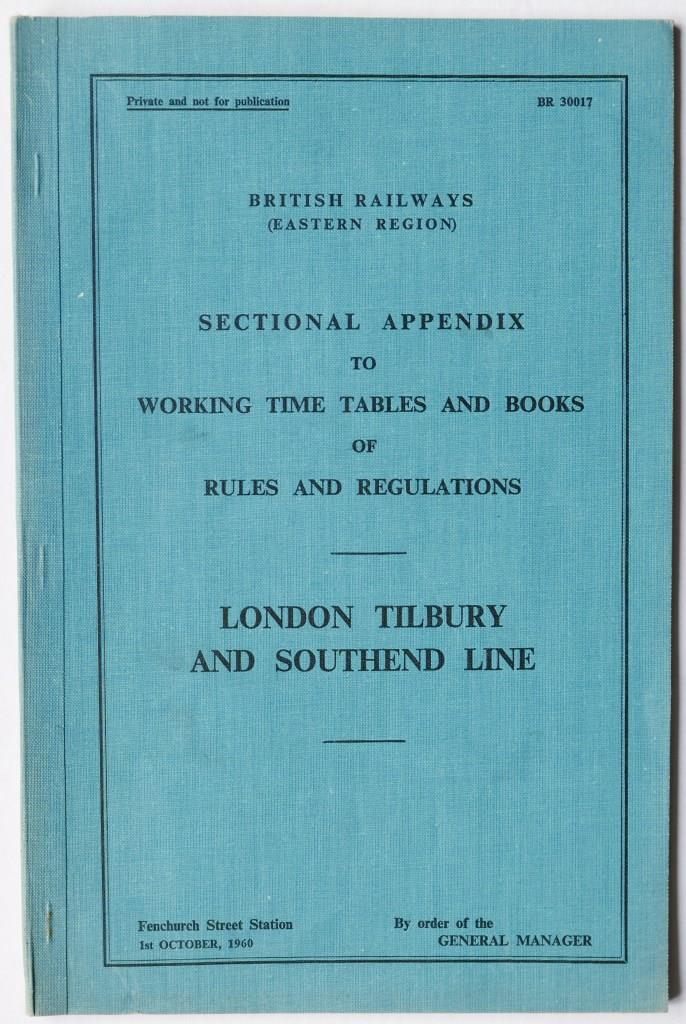 58BR(E) ‘Sectional Appendix to the WTT and books of Rules and Regulations London Tilbury and Southend Line’. 46pp, foolscap sized, cloth bound covers, dated October 1960. £4