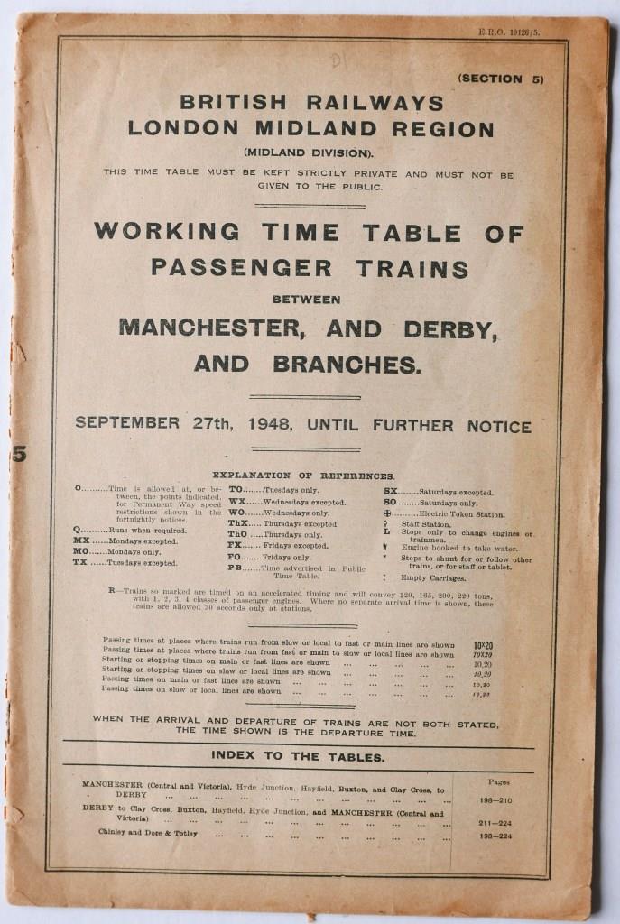 76BR(M) Midland Division section 5 working timetable of passenger trains between Liverpool, Manchester and Derby and branches. 32pp dated May 1948. £6