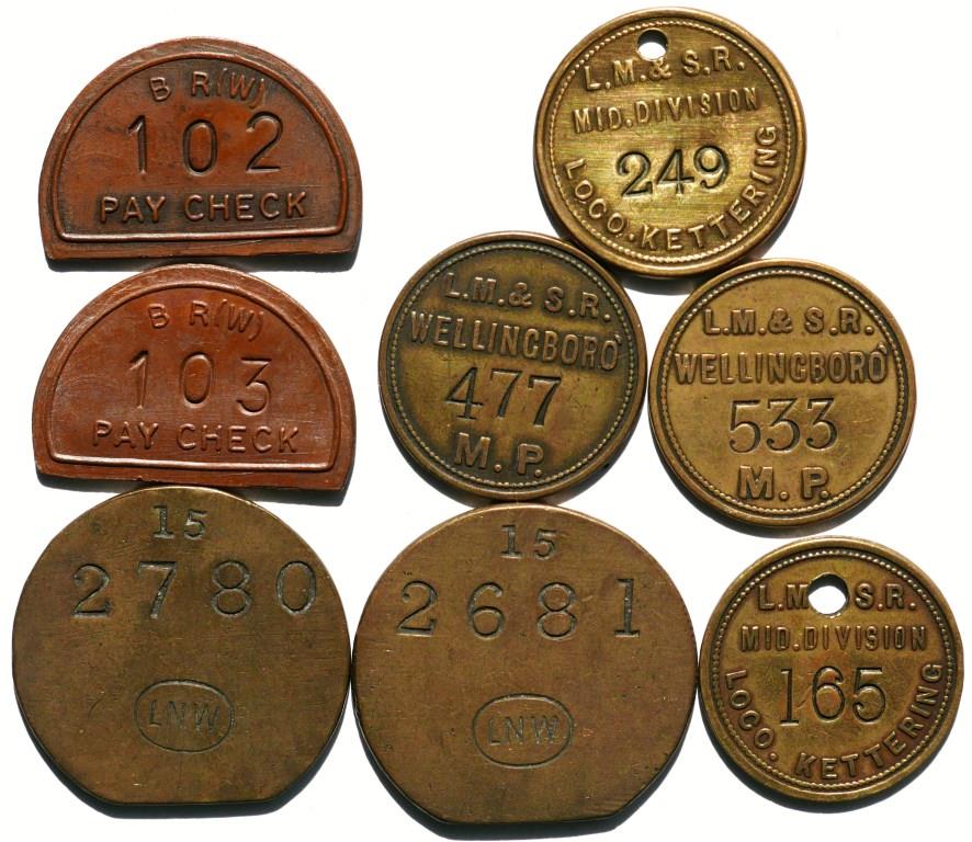 308 brass paychecks. 2 x LNWR, 2 x BR(W), 2 x LMS Loco Kettering, 2 x LMS Wellingboro’ MP. £24