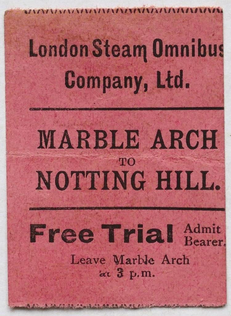 706London Steam Omnibus Company paper ticket for a free trial of the Marble Arch to Notting Hill service. Not Sold
