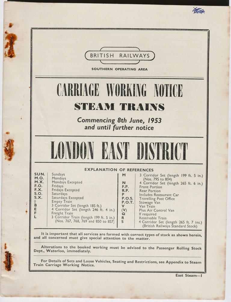 77BR(S) London East District Carriage Working Notice Steam Trains. 161pp dated June 1953. Rusty staples. £8