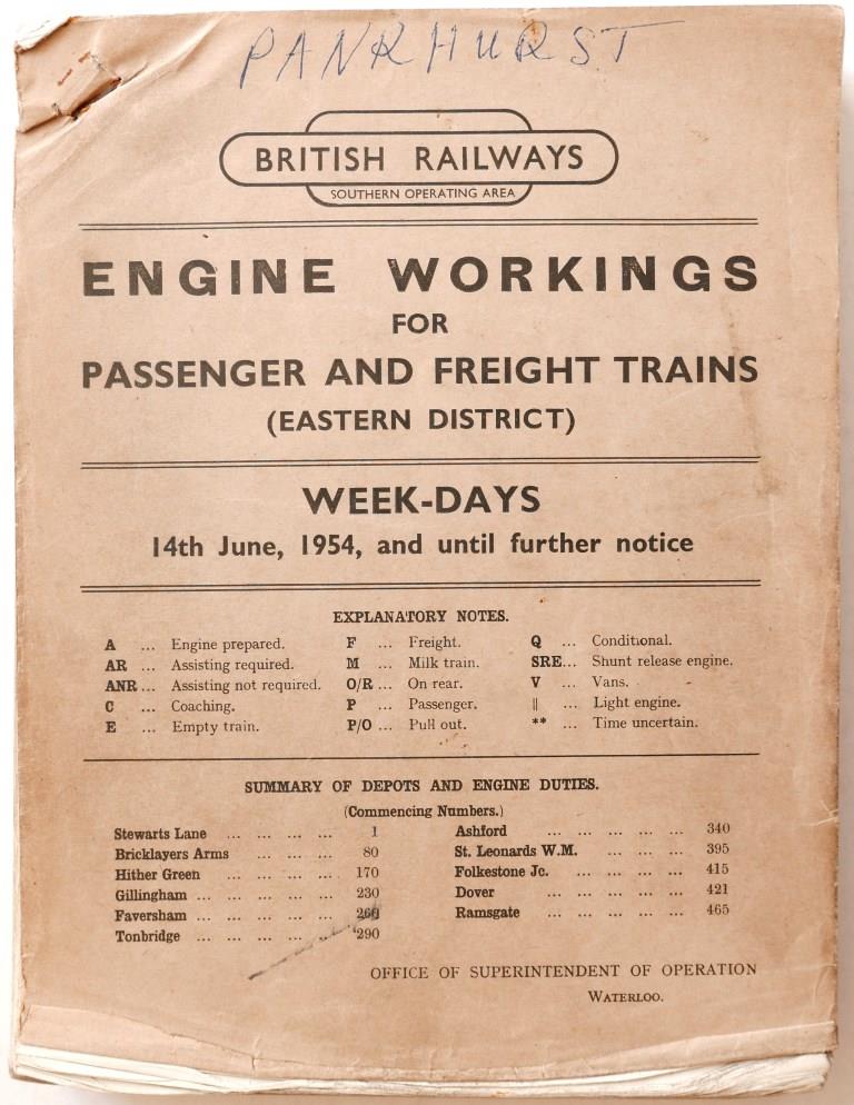 84BR(S) Eastern District booklet ‘Engine Workings for Passenger and Freight Trains – Weekdays’. Card covers, 318pp, dated June 1954. Some cover wear.£16