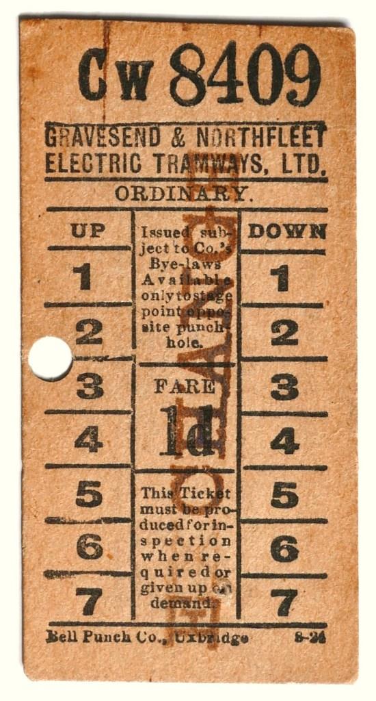 721Gravesend and Northfleet Electric Tramways Ltd 1d (overstamped “Exchange”) geographical punch type ticket. £60