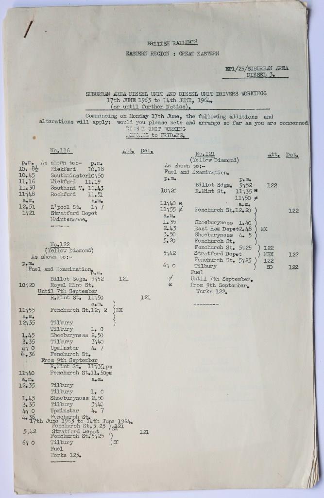 76BR(E) Great Eastern 6 typescript page, foolscap sized document ‘Suburban Area Diesel Unit and Diesel Unit Drivers Workings’. Dated June 1963. £55