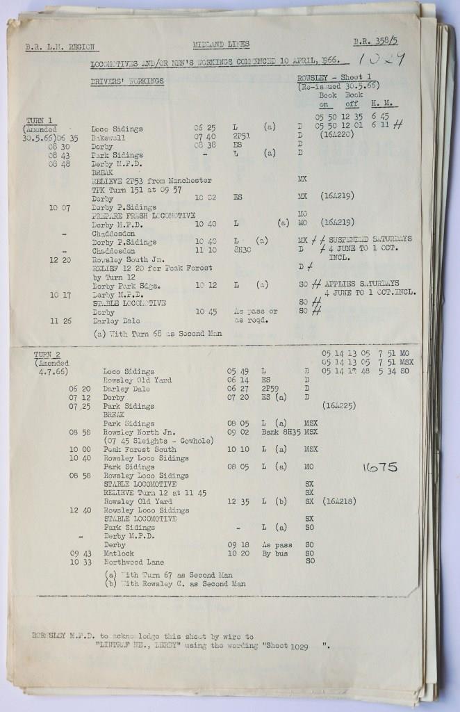 78BR(M) Midland Lines 25 typescript page document of locomotive, men’s, diesel driver and secondman’s workings for Rowsley depot. Includes amendment and duplicate pages. Dated May/June 1966. £110