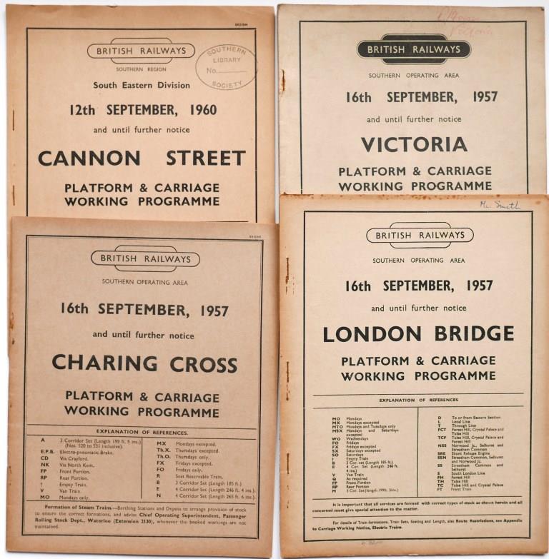 | 114 | Four BR(S) ‘Platform & Carriage Working Programme’ booklets for Cannon Street September 1960, Charing Cross, London Bridge, Victoria (all September 1957). Each 14 - 58pp. | £18 |  |