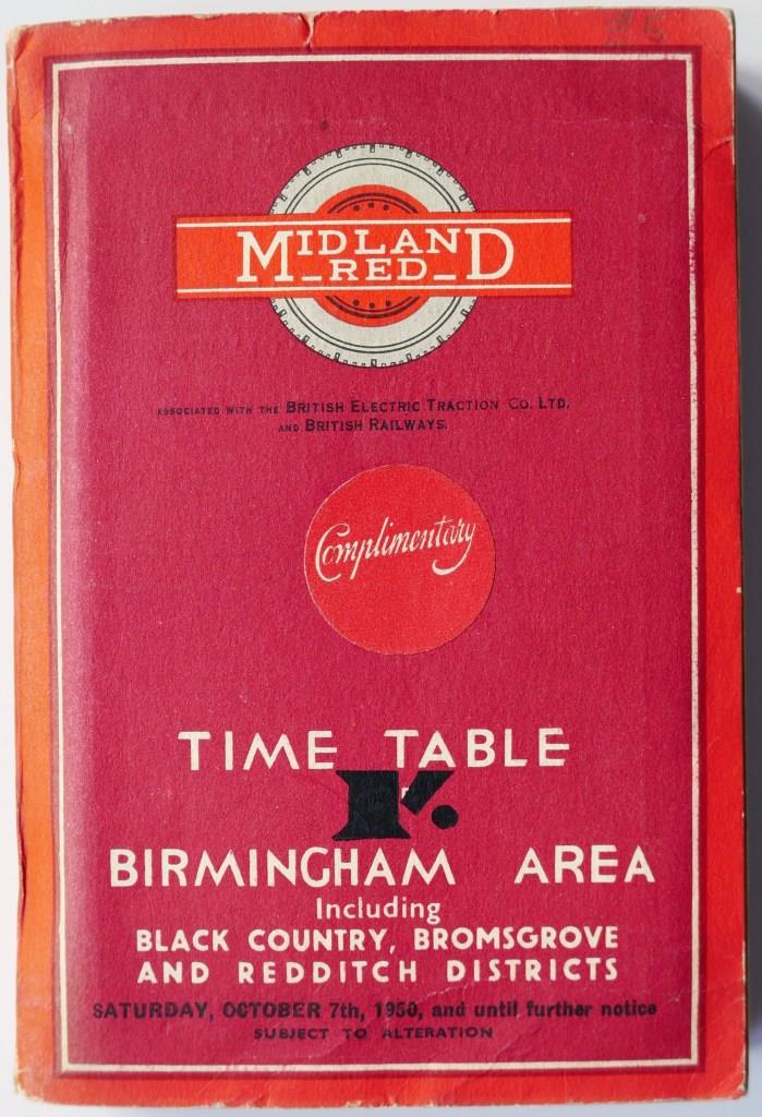 | 130 | Midland Red Birmingham area timetable booklet dated October 1950. Maroon and red covers, 680pp plus fold out map. | £8 |  |