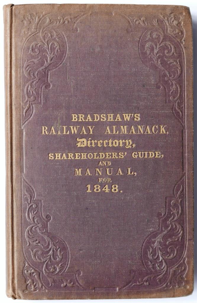 | 28 | Bradshaw’s published ’Railway Almanack, Directory, Shareholders Guide and Manual’ dated 1848. Cloth bound hardback covers with title in gold on front, 137pp plus adverts and fold out map (torn and detached). | £36 |  |