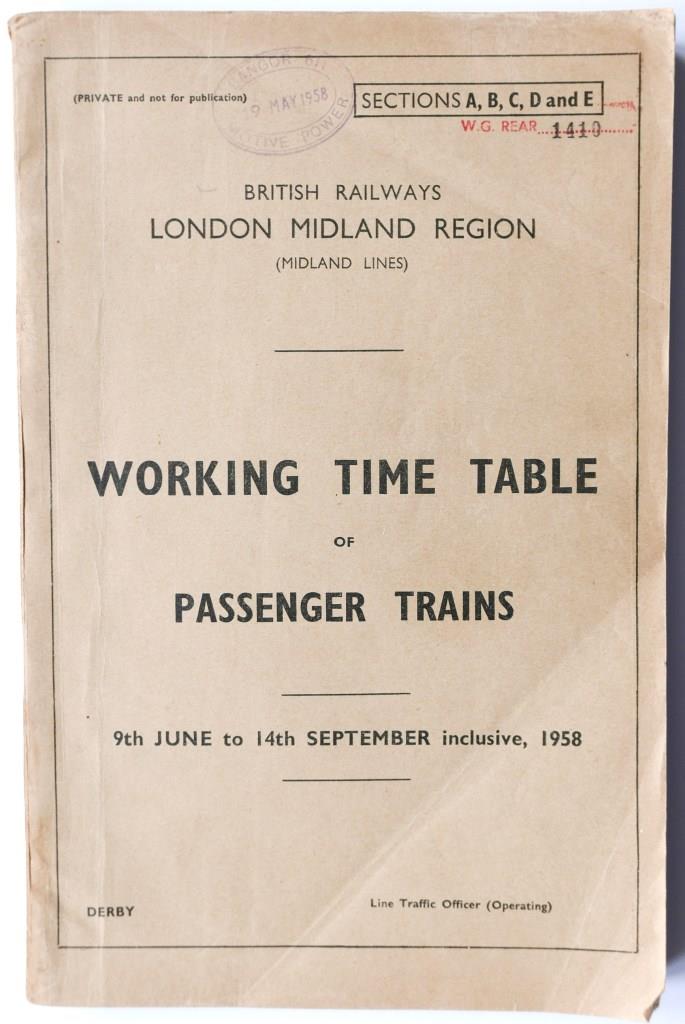 | 64 | BR(M) Midland Lines sections A - E working timetable of passenger trains. 300+pp dated June 1958. Rusty staples. | £26 |  |