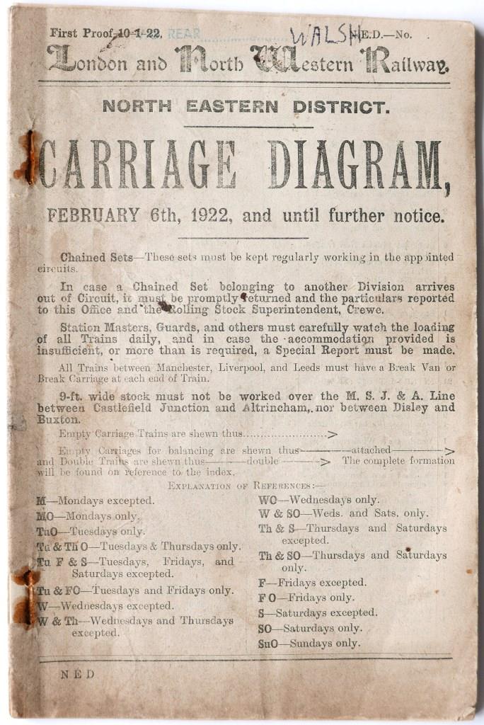 | 647 | LNWR North Eastern District ‘Carriage Diagram’ booklet. 70pp showing formation of the trains. Dated February 1922. Rusty staples removed causing separation of sections. | £80 |  |