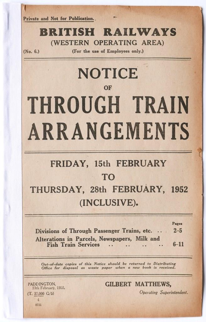 | 74 | BR(W) ’Notice of Through Train Arrangements’ No.6 dated 15th February 1952. 11pp, spine taped. | £19 |  |