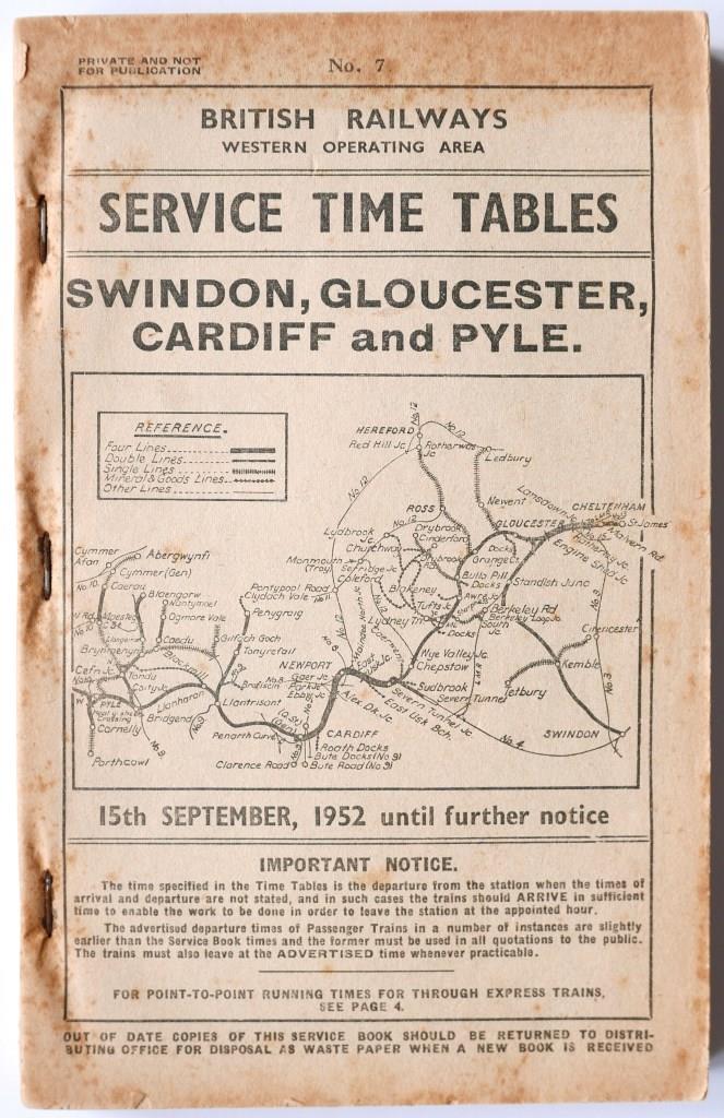 | 82 | BR(W) No.7 section service timetable covering Swindon, Gloucester, Cardiff and Pyle. 360pp, dated September 1952. | £15 |  |