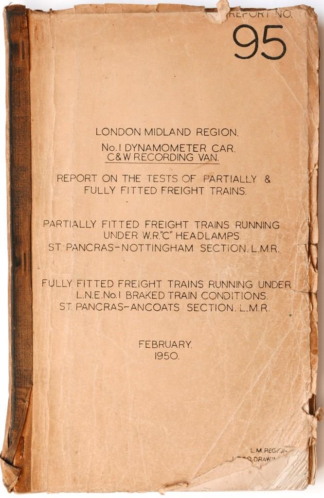 | 95 | BR(M) foolscap sized report on dynamometer car tests on partially and fully fitted freight trains. 11 typescript pages plus many tables and charts. Dated February 1950. | £17 |  |